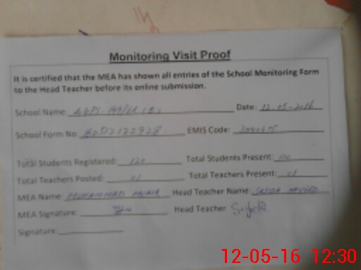| Attendance Register | Head Teacher | MEA with School | Visit Proof |