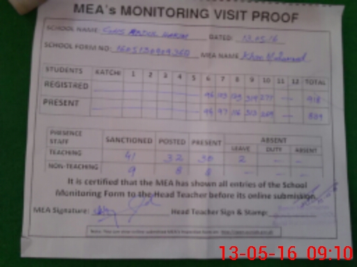 | Attendance Register | Head Teacher | MEA with School | Visit Proof |