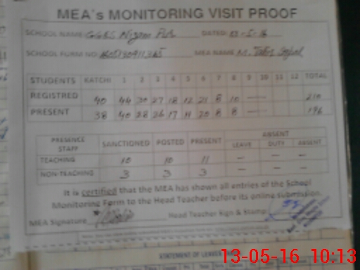 | Attendance Register | Head Teacher | MEA with School | Visit Proof |