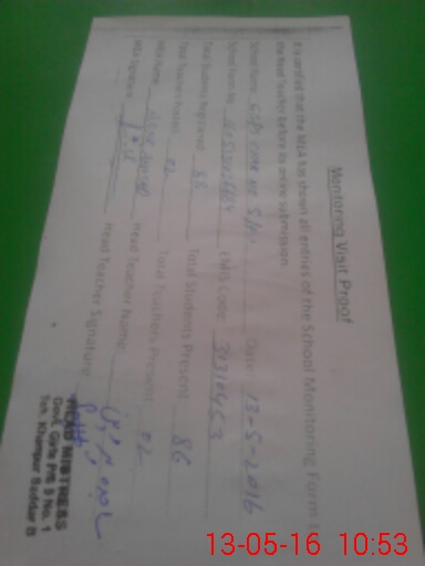 | School Visited by School Health & Nutrition Supervisor (No. of Visits) | 1 | Name1: | Iram Naz | Name2: | Nil |