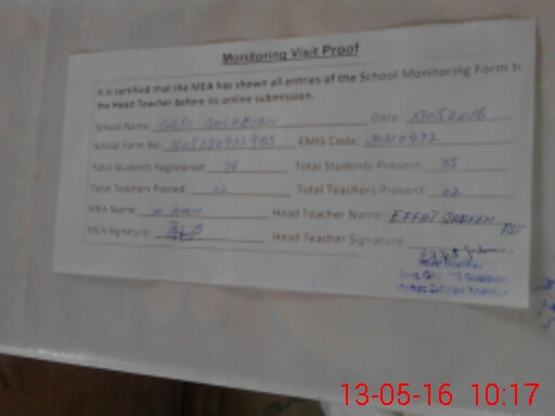 | Attendance Register | Head Teacher | MEA with School | Visit Proof |