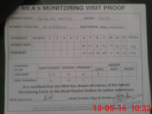 | Attendance Register | Head Teacher | MEA with School | Visit Proof |