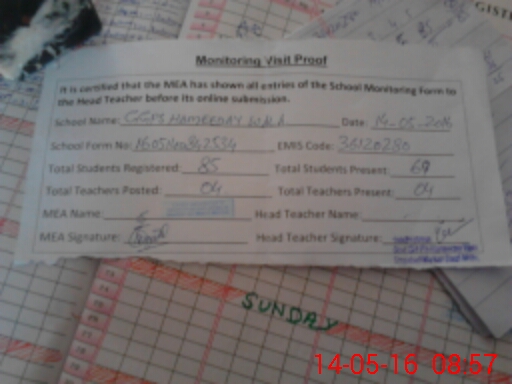 | Attendance Register | Head Teacher | MEA with School | Visit Proof |