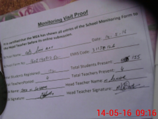 | Attendance Register | Head Teacher | MEA with School | Visit Proof |
