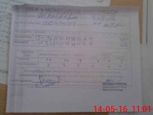 | Attendance Register | Head Teacher | MEA with School | Visit Proof |