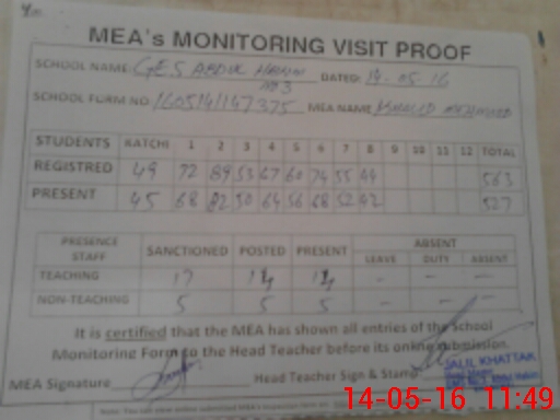 | Attendance Register | Head Teacher | MEA with School | Visit Proof |