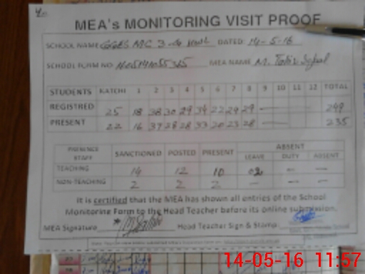| Attendance Register | Head Teacher | MEA with School | Visit Proof |