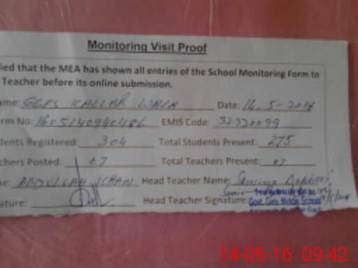 | Attendance Register | Head Teacher | MEA with School | Visit Proof |