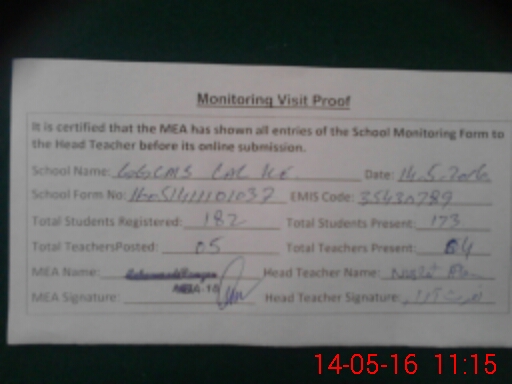 | Attendance Register | Head Teacher | MEA with School | Visit Proof |