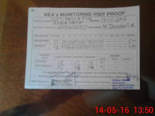 | Certified that this School was Inspected by the Undersigned MEA/DMO Today and the Information Stated Above is as Per Record. | |||||
