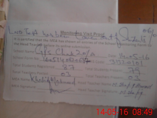 | Attendance Register | Head Teacher | MEA with School | Visit Proof |