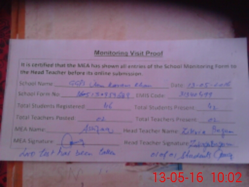 | Attendance Register | Head Teacher | MEA with School | Visit Proof |