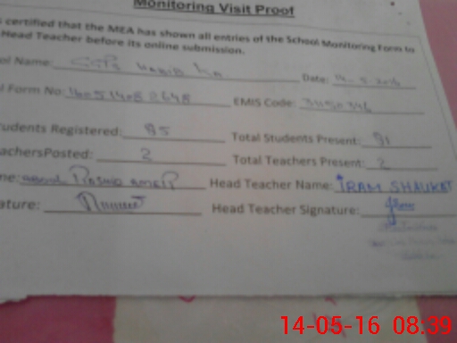| Attendance Register | Head Teacher | MEA with School | Visit Proof |