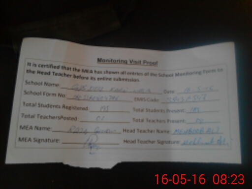 | Attendance Register | Head Teacher | MEA with School | Visit Proof |