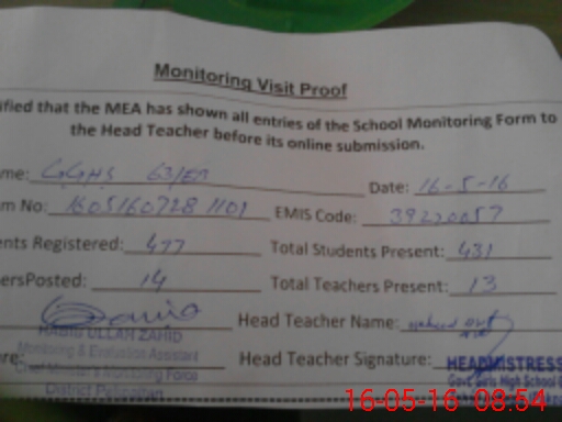 | School Visited by School Health & Nutrition Supervisor (No. of Visits) | 1 | Name1: | Mushtaq Ahmed | Name2: | |