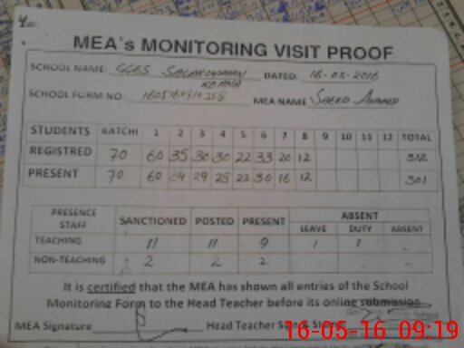 | Attendance Register | Head Teacher | MEA with School | Visit Proof |