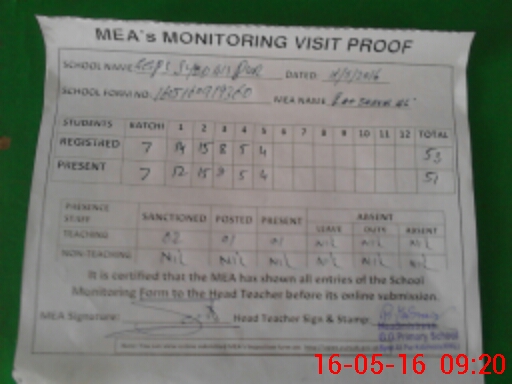 | Attendance Register | Head Teacher | MEA with School | Visit Proof |