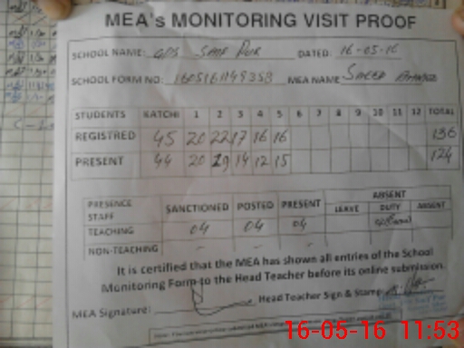 | Attendance Register | Head Teacher | MEA with School | Visit Proof |