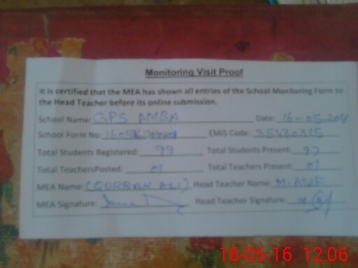 | Certified that this School was Inspected by the Undersigned MEA/DMO Today and the Information Stated Above is as Per Record. | |||||