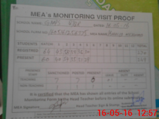 | Attendance Register | Head Teacher | MEA with School | Visit Proof |