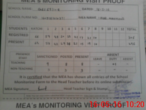 | Attendance Register | Head Teacher | MEA with School | Visit Proof |