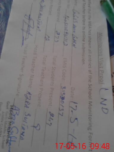 | School Visited by School Health & Nutrition Supervisor (No. of Visits) | 1 | Name1: | NAVEED UL HUSSAN | Name2: | |