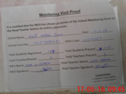 | Attendance Register | Head Teacher | MEA with School | Visit Proof |