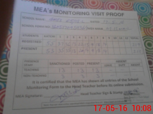 | Attendance Register | Head Teacher | MEA with School | Visit Proof |