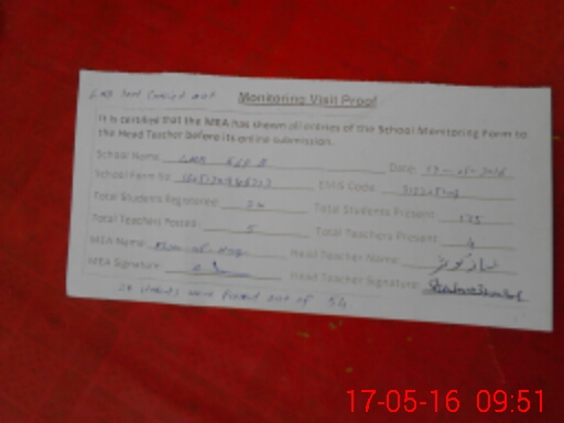 | Attendance Register | Head Teacher | MEA with School | Visit Proof |