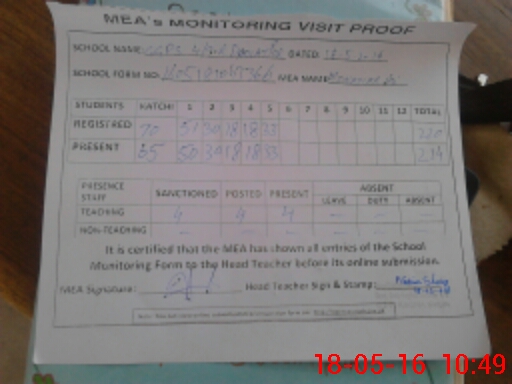 | Attendance Register | Head Teacher | MEA with School | Visit Proof |