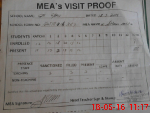 | Attendance Register | Head Teacher | MEA with School | Visit Proof |