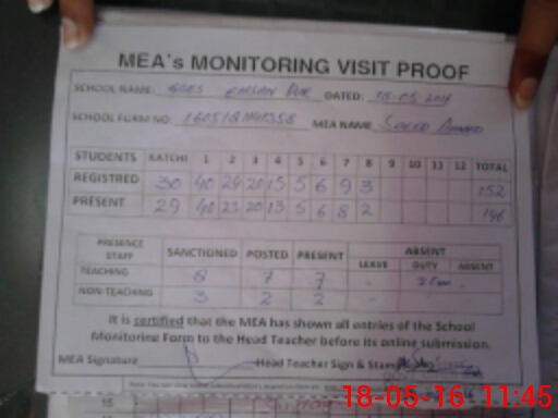 | Attendance Register | Head Teacher | MEA with School | Visit Proof |