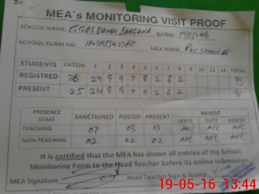 | Attendance Register | Head Teacher | MEA with School | Visit Proof |