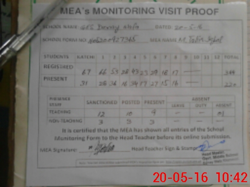 | Attendance Register | Head Teacher | MEA with School | Visit Proof |
