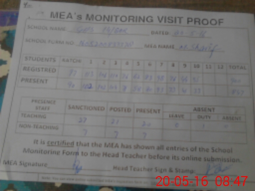 | Attendance Register | Head Teacher | MEA with School | Visit Proof |