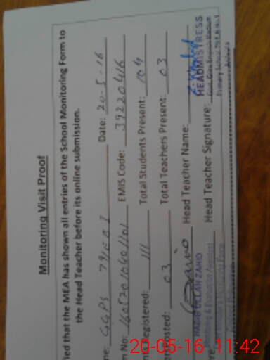 | Attendance Register | Head Teacher | MEA with School | Visit Proof |