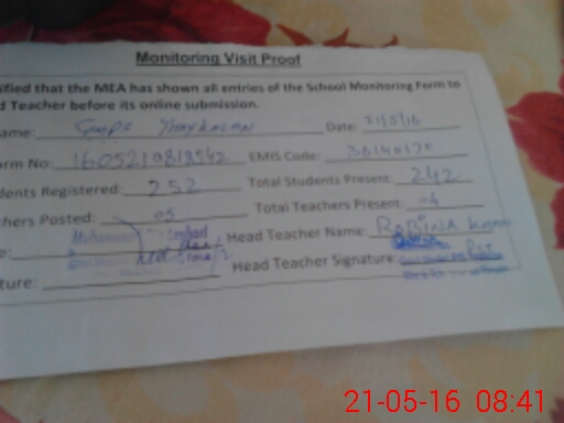 | Attendance Register | Head Teacher | MEA with School | Visit Proof |