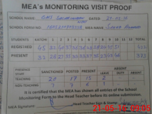 | Attendance Register | Head Teacher | MEA with School | Visit Proof |