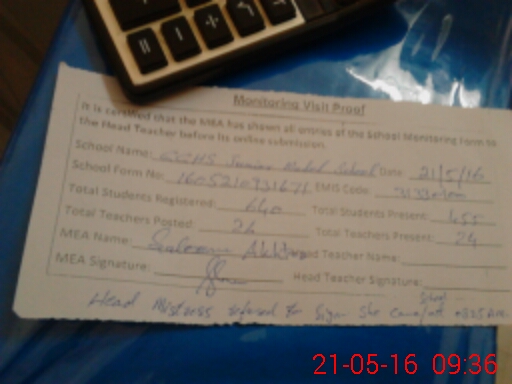 | Remarks (Use Separate Page if Required): Head mistress Asma Fatima came school at 0824 so as per SOP she marked as absent due to her absenty she refused to sign on visit proof chit | |||||