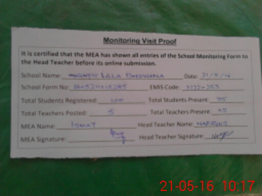 | Certified that this School was Inspected by the Undersigned MEA/DMO Today and the Information Stated Above is as Per Record. | |||||