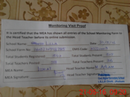 | Certified that this School was Inspected by the Undersigned MEA/DMO Today and the Information Stated Above is as Per Record. | |||||