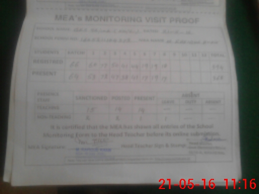 | Attendance Register | Head Teacher | MEA with School | Visit Proof |