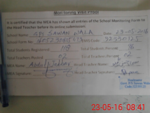 | EMIS Code: 32330125 | Name of School: GPS SAWAN WALA | |||