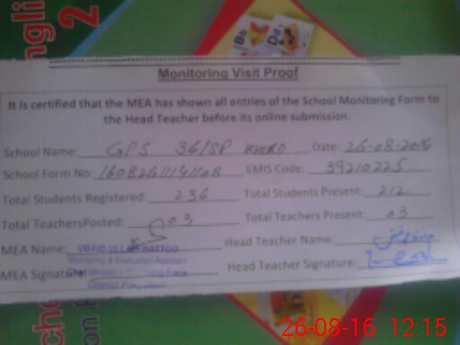| School Visited by School Health & Nutrition Supervisor (No. of Visits) | 1 | Name1: | AFTAB RAHIM GILL | Name2: | Nil |