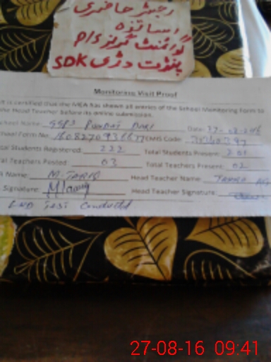 | School Visited by School Health & Nutrition Supervisor (No. of Visits) | 1 | Name1: | Sajid Niaz | Name2: | O |