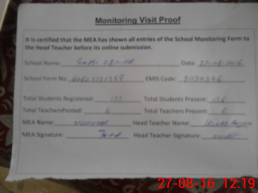 | EMIS Code: 31130346 | Name of School: GMPS CHAK NO 281 HR | |||