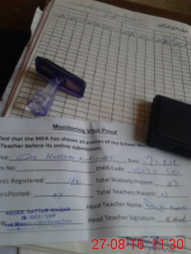 | Attendance Register | Head Teacher | MEA with School | Visit Proof |
