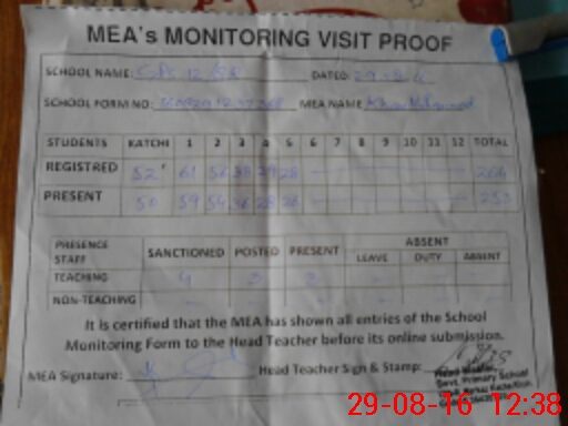 | Attendance Register | Head Teacher | MEA with School | Visit Proof |