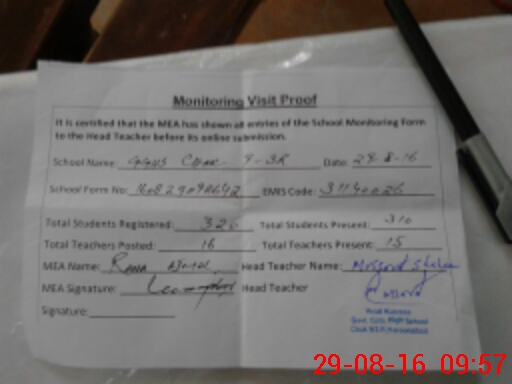 | Attendance Register | Head Teacher | MEA with School | Visit Proof |