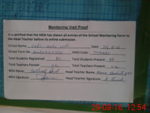 | Attendance Register | Head Teacher | MEA with School | Visit Proof |